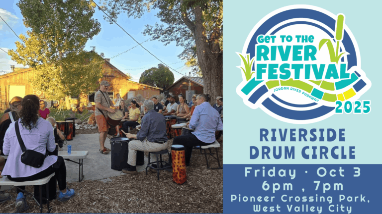 An evening of rhythm and the sounds of nature along the Jordan River. People of all ages & abilities are welcome. Drums & percussion instruments will be provided. Circles will be lead starting at 6pm & 7pm in Pioneer Crossing Park. Free admission for all participants.