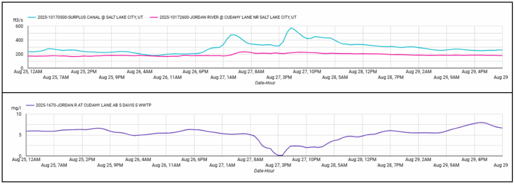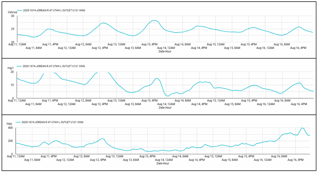 In the days leading up to the August 14 fish kill, water temperatures spiked to 28.2 °C (83 °F). That’s hot for a river in Utah, and stressful for fish. Warm water not only pushes fish to their physiological limits – they expend more energy, and require more oxygen – warm water also holds less oxygen. During the day, algae and aquatic plants release oxygen through photosynthesis, but at night photosynthesis stops while both plants and algae (and fish) continue to respire, consuming oxygen. That nighttime drawdown, combined with elevated temperatures, caused dissolved oxygen to plummet for several hours. When investigators visited Willow Park, the river looked like ‘pea soup’ with algae. A bloom that dense demands even more oxygen to respire, further depressing oxygen levels and limiting the river’s ability to recover. Turbidity (a measurement of water cloudiness) data at this location provides more clues about the amount of algae moving out of Utah Lake and into the Jordan River, and how much stress it puts on fish.